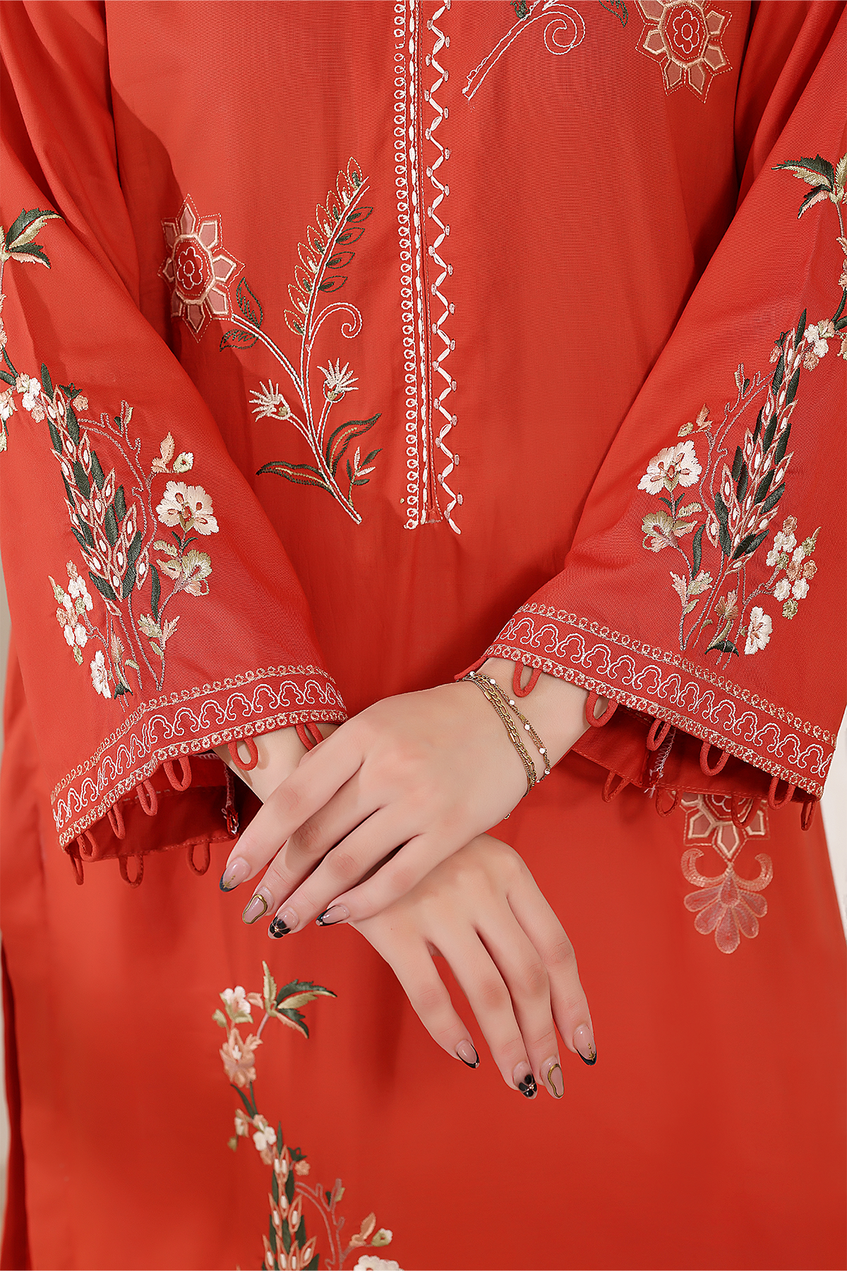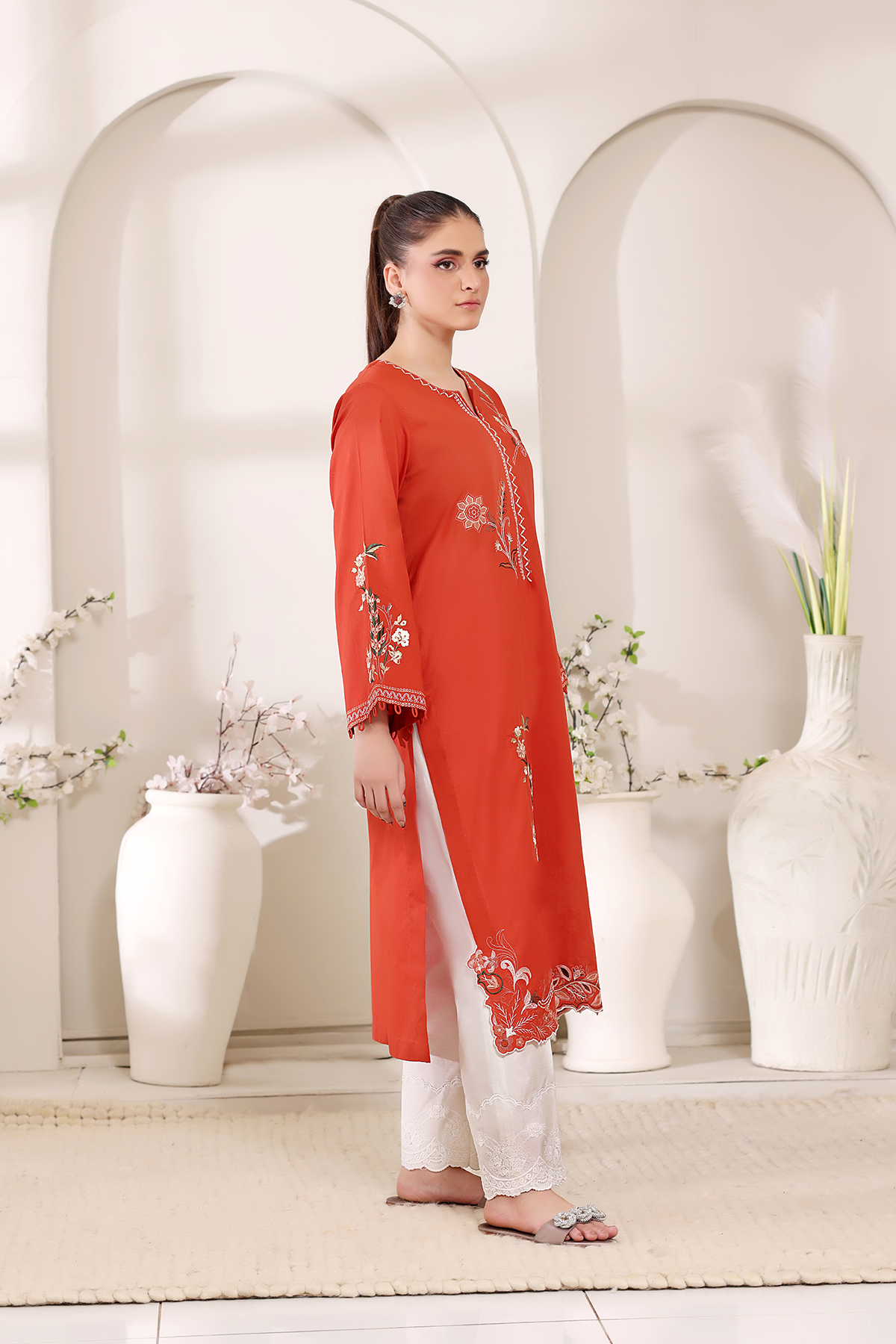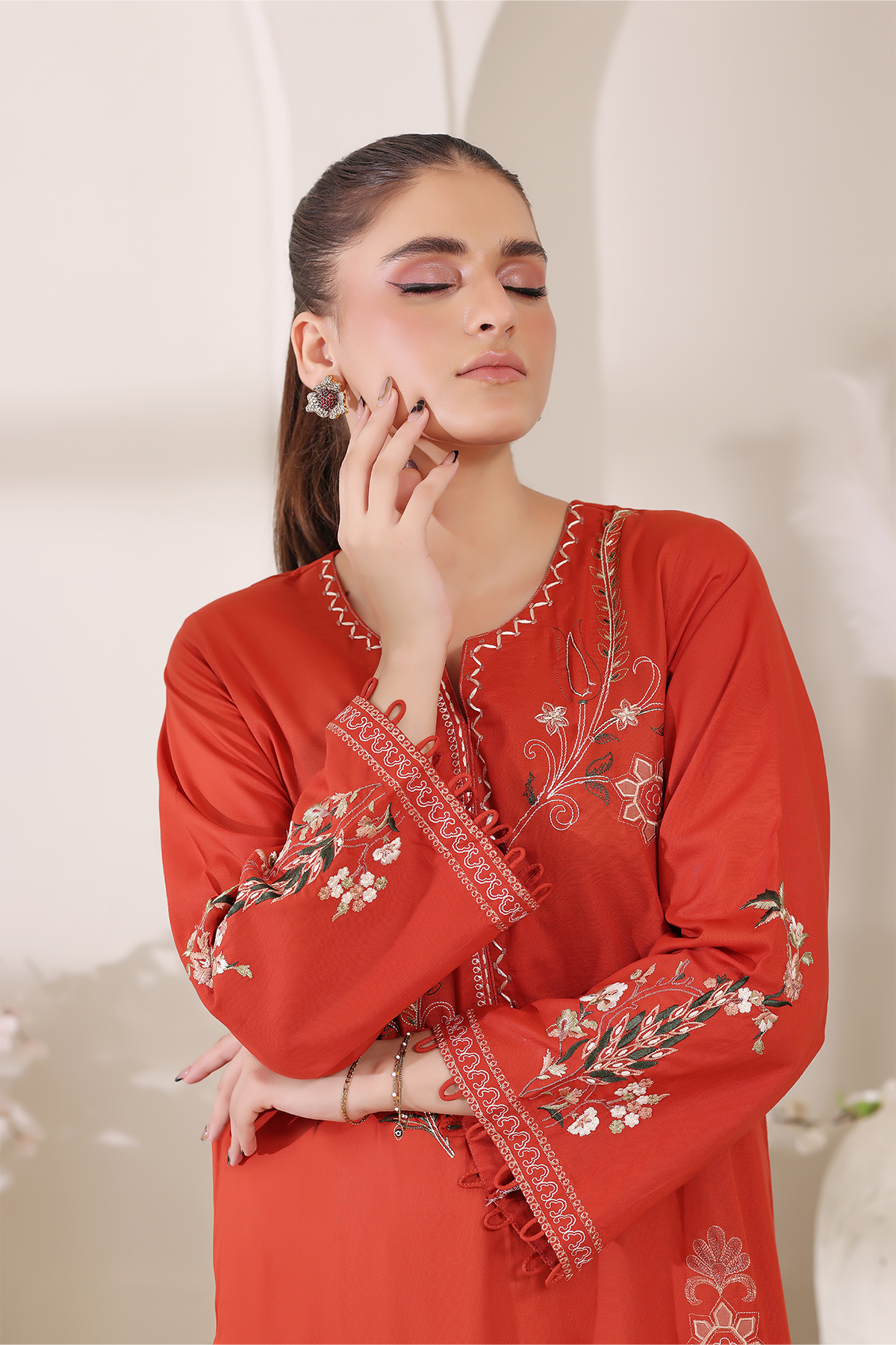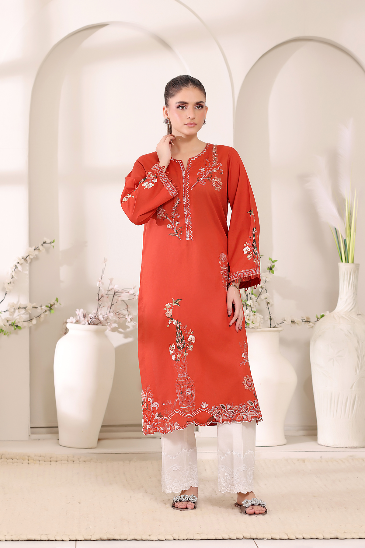 A bold yet graceful statement, Amiraah is rendered in striking burnt orange lawn with embroidery and applique craftsmanship. Its vibrant energy celebrates confidence while staying delicately refined.