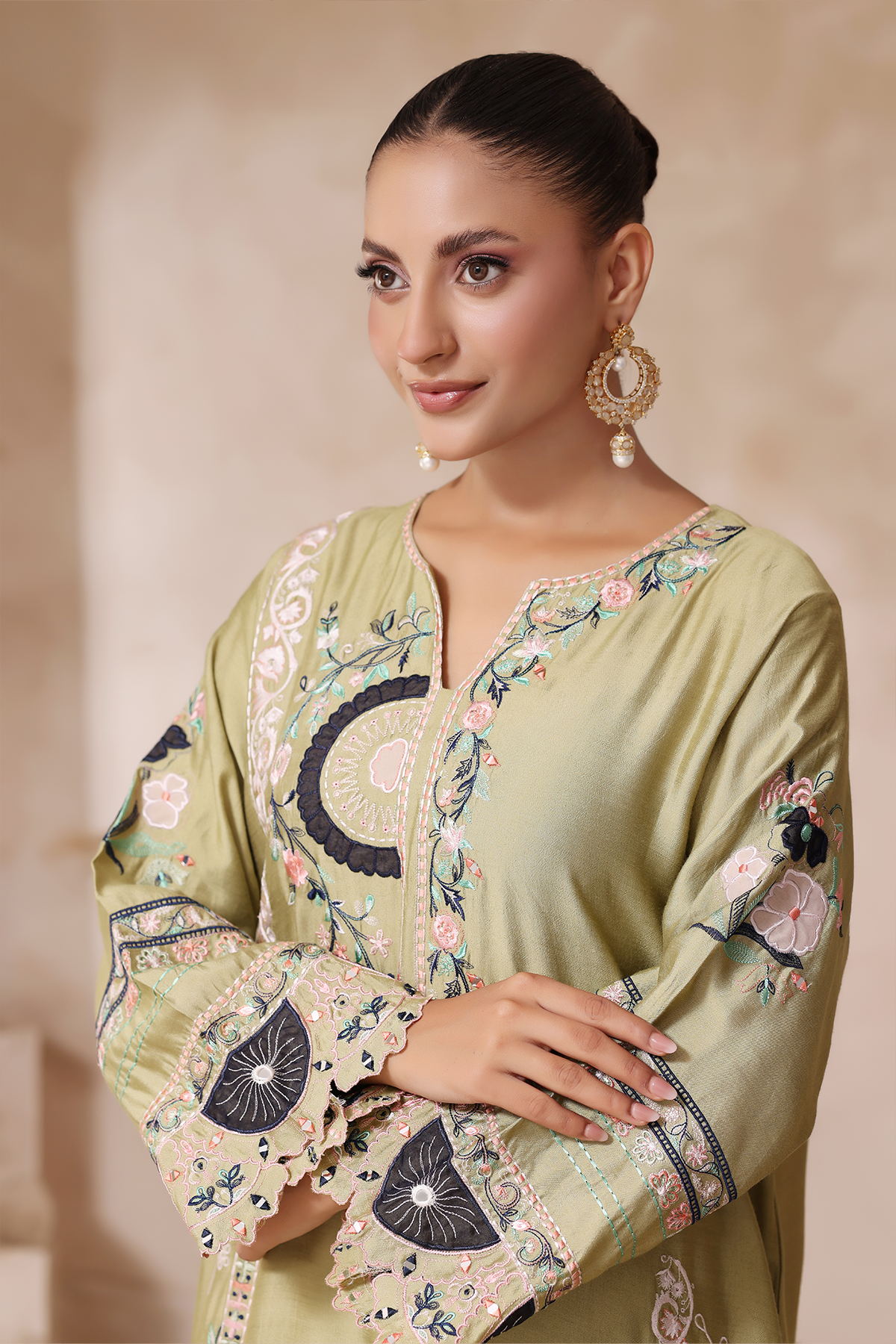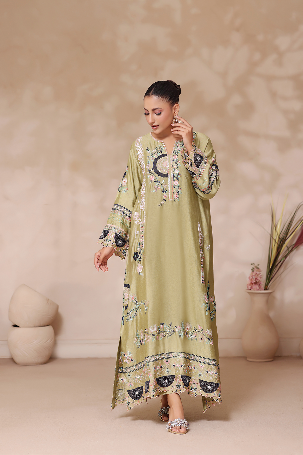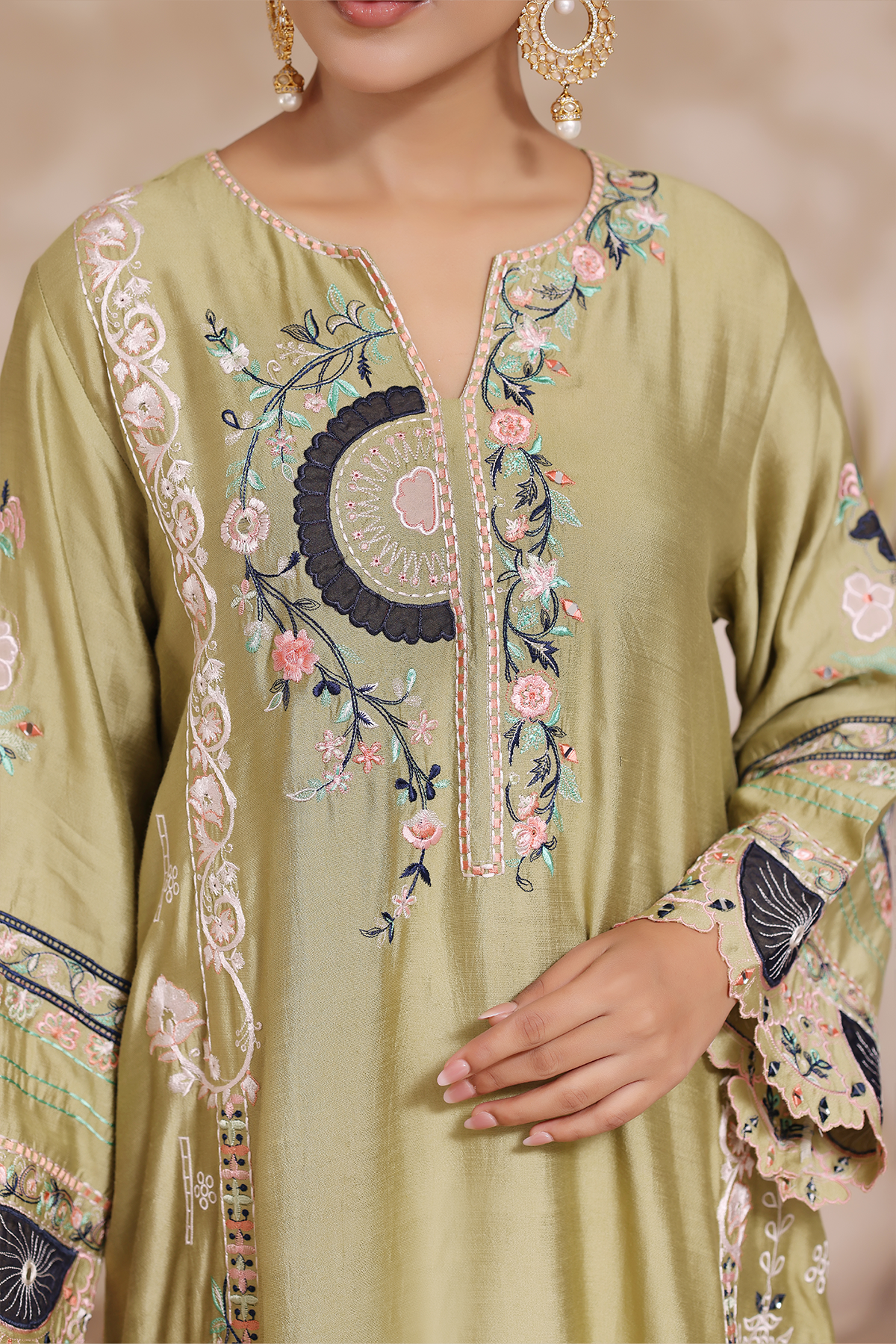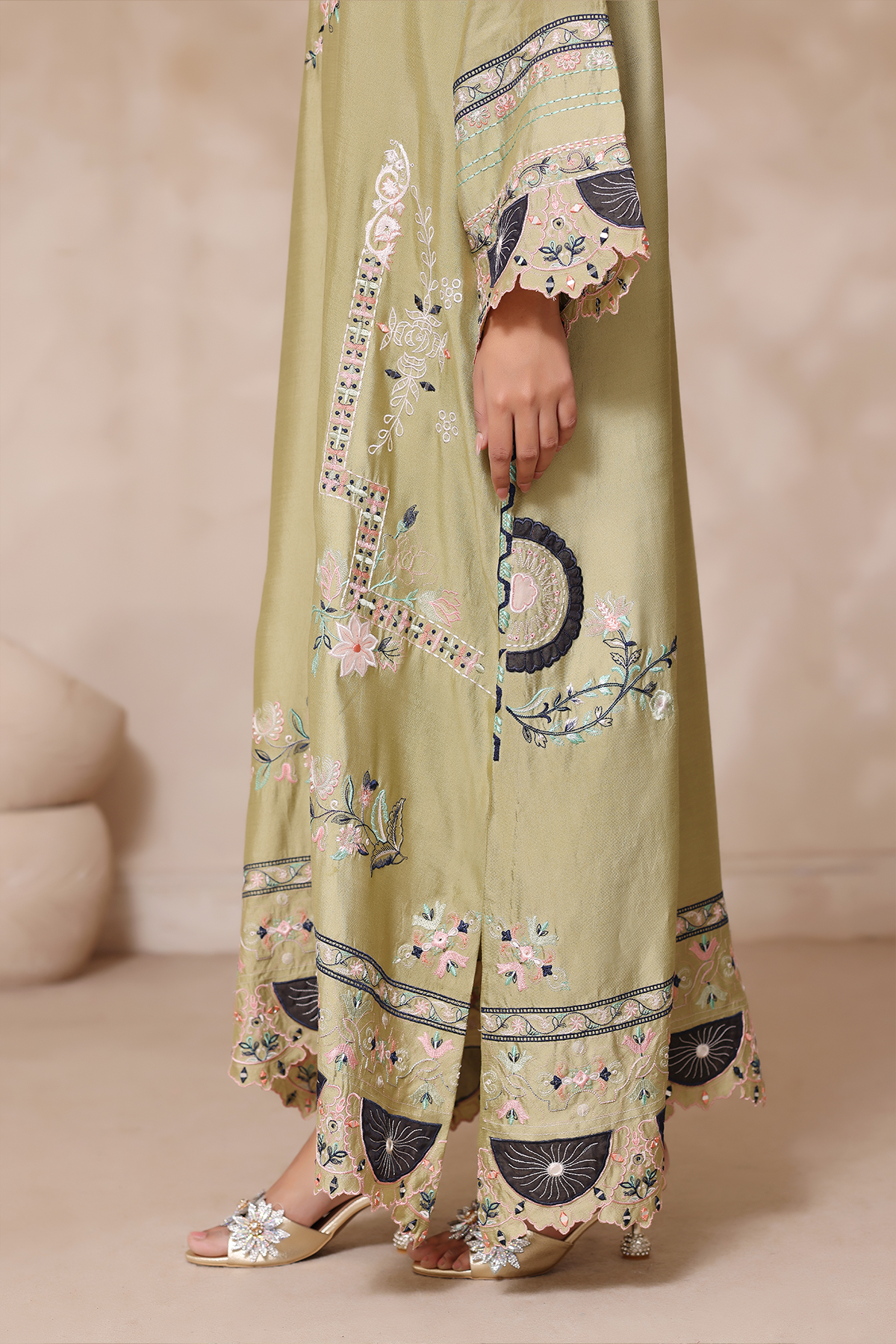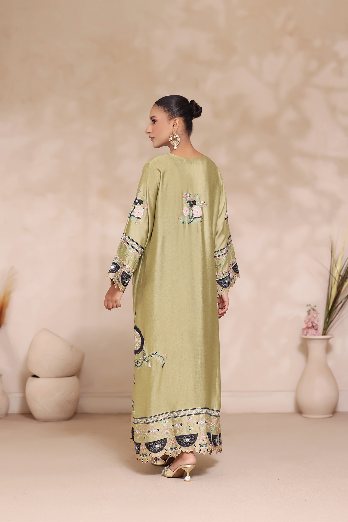 Radiating timeless elegance, this olive-green kaftan is a stunning fusion of comfort and sophistication. Crafted from luxurious silk fabric, it features a fluid drape that flatters every silhouette. The ensemble is richly detailed with ornate thread embroidery in hues of navy, blush pink, and ivory, accented by touches of zari and resham work that add a refined shimmer. The neckline and borders are intricately adorned with floral and geometric motifs, while the wide sleeves and hem are finished with exquisite cutwork-style embroidery for a graceful finish. The kaftan’s relaxed yet regal silhouette makes it an ideal choice for festive occasions, evening gatherings, or elegant resort wear — a statement piece that embodies effortless sophistication.