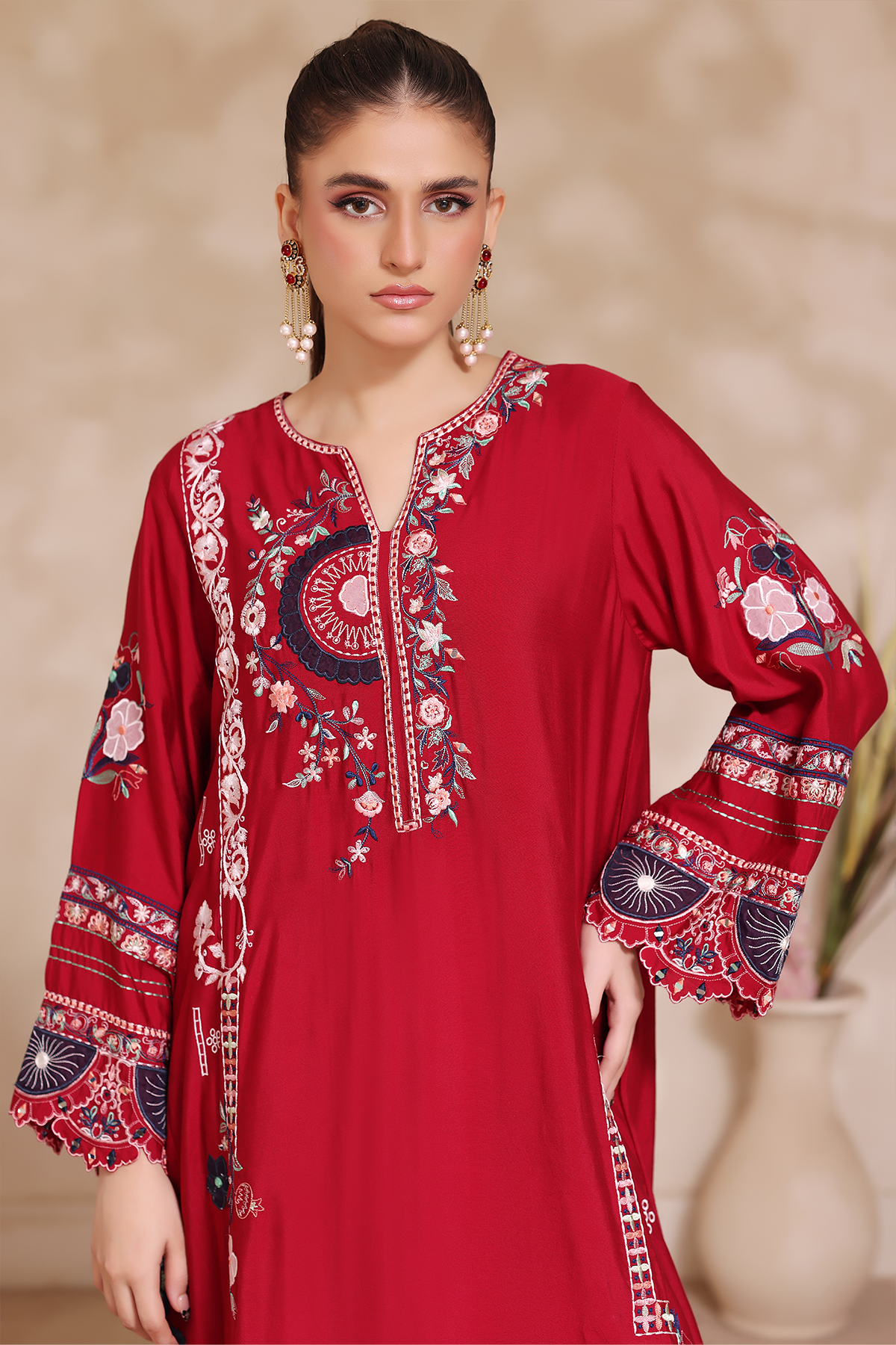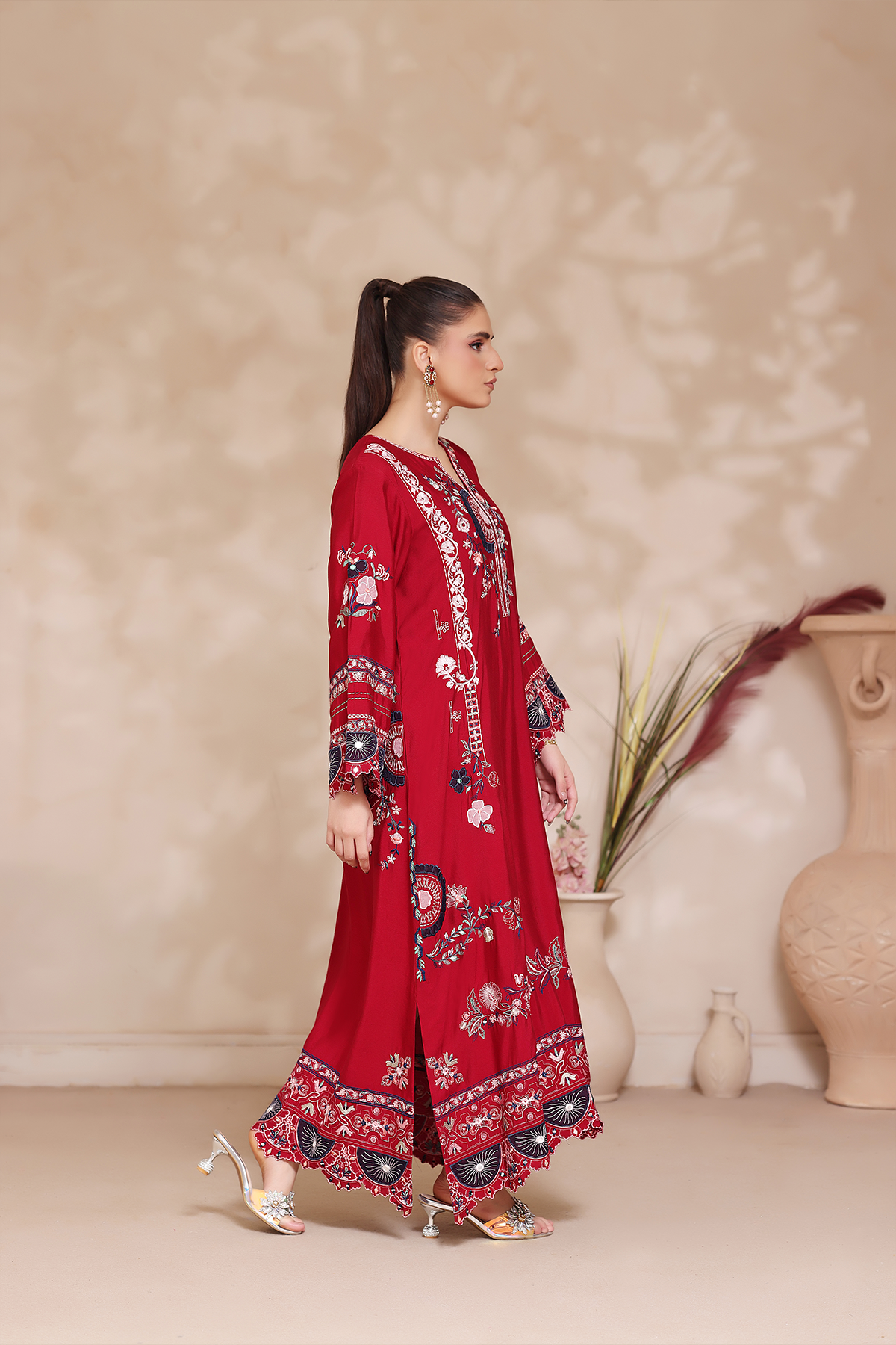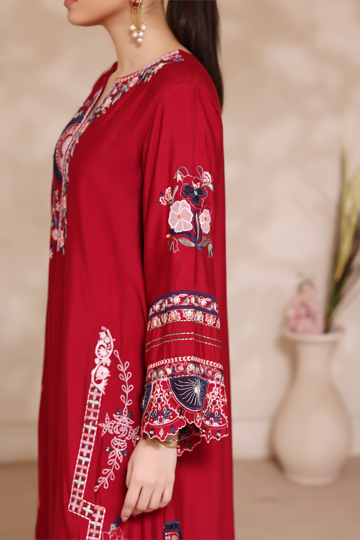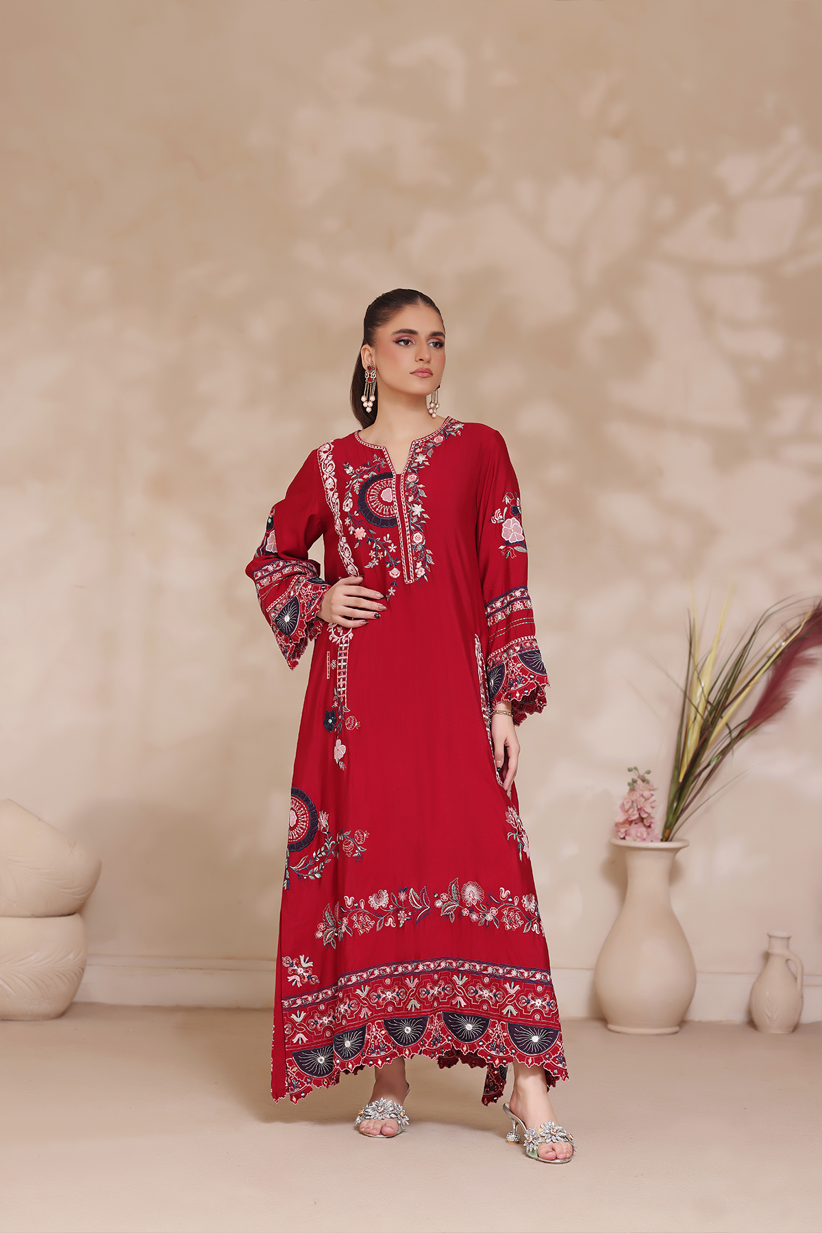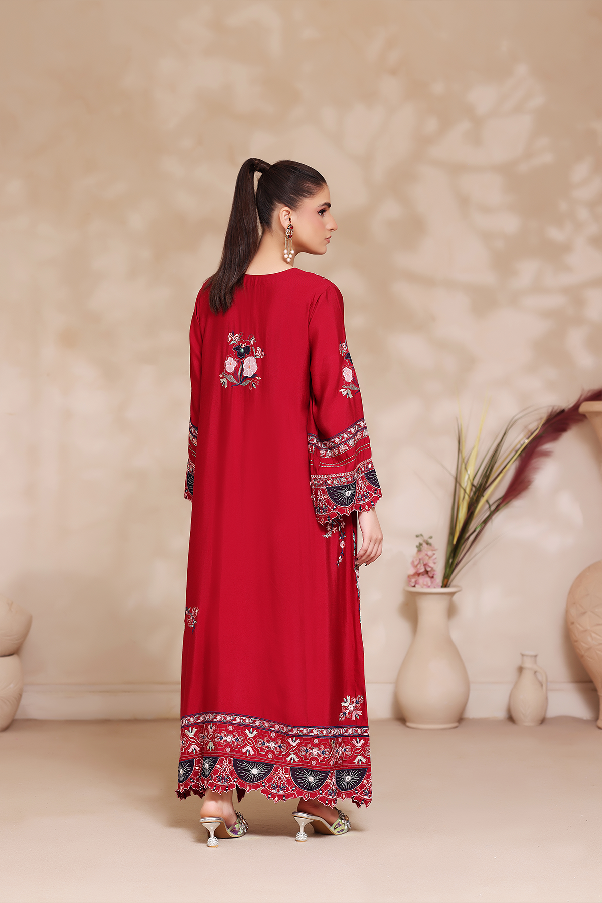 A captivating blend of tradition and elegance, this crimson red kaftan makes a bold style statement. Crafted from luxurious silk fabric with a soft, flowing texture, it offers a regal drape that moves gracefully with every step. The kaftan is exquisitely embellished with intricate thread embroidery in contrasting shades of navy, ivory, and blush pink, highlighted with zari and resham detailing that add a touch of shimmer. The V-shaped neckline and wide sleeves are richly embroidered with ornate motifs, while the hemline features delicate scalloped cutwork that enhances its charm. Radiating festive allure, this kaftan is ideal for evening gatherings, cultural festivities, or elegant dinner affairs — a true embodiment of timeless sophistication and contemporary grace.