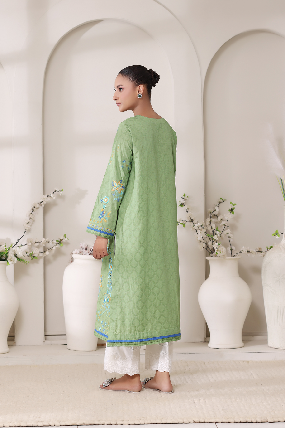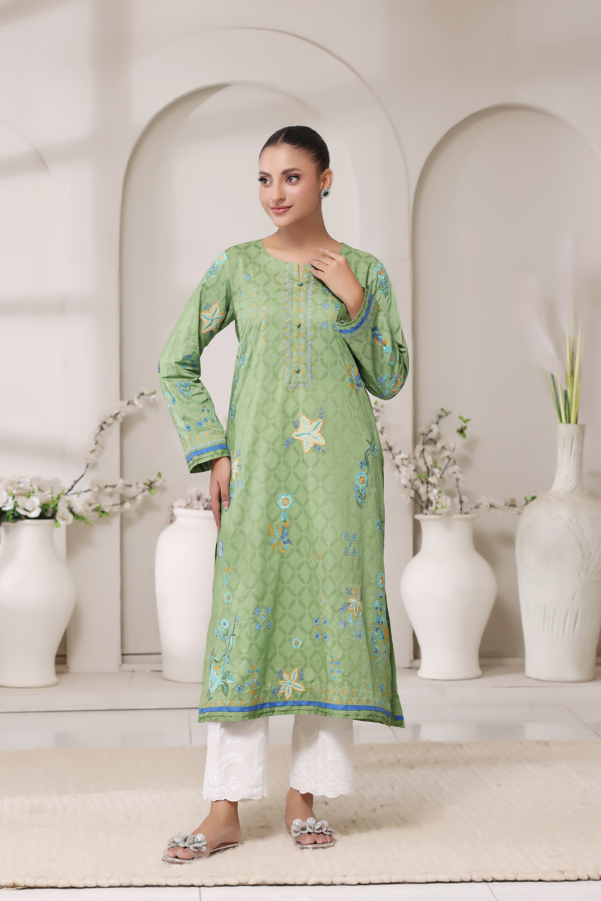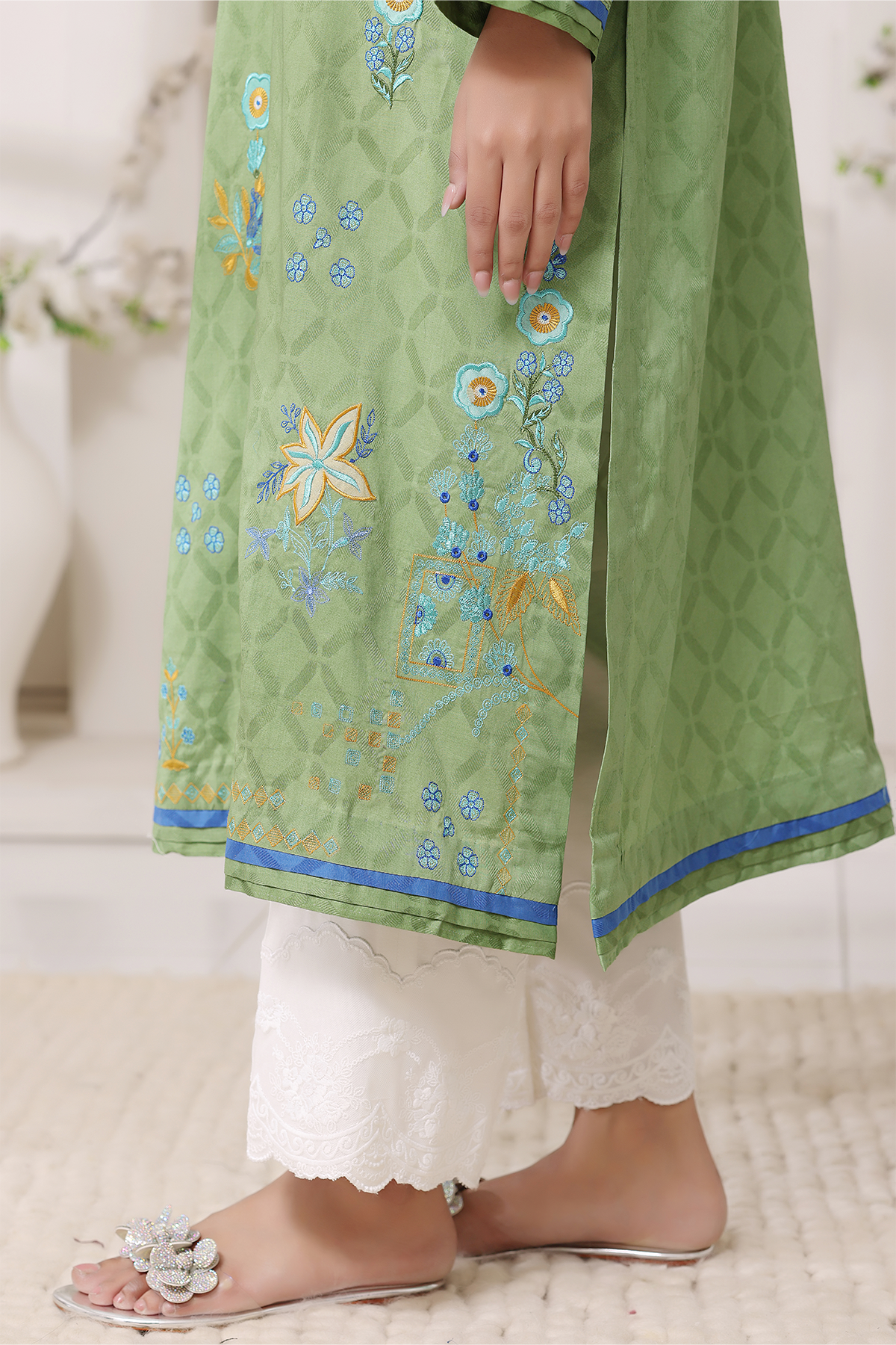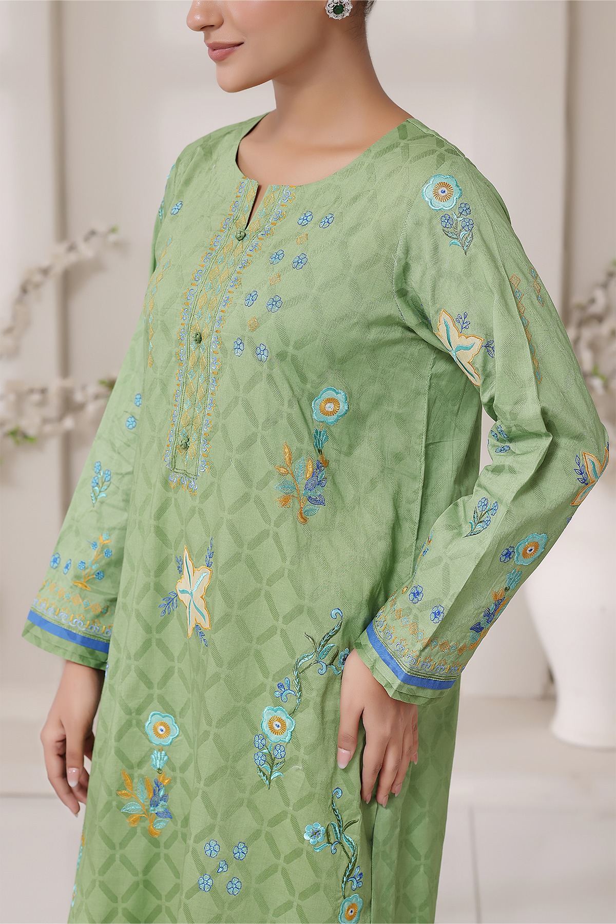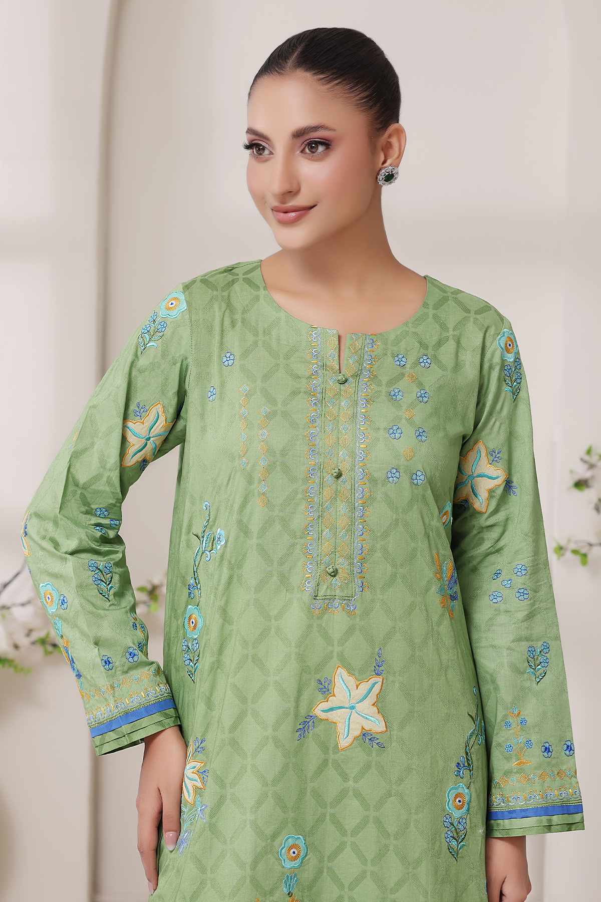 Refreshing and serene, Zohrah is crafted from self-lawn in soft mint tones. Adorned with intricate embroidery and applique, it embodies a gentle grace that feels light yet luxurious.